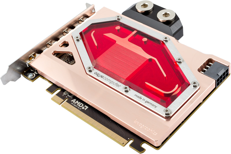 Gefertigt wird der kryographics R9 NANO aus hochreinem Elektrolyt-Kupfer. Der Deckel wird aus Plexiglas CNC bearbeitet. Die Kanten werden hochglanzpoliert und sind absolut klar. Die komplette Bearbeitung und Montage erfolgt direkt bei Aqua Computer in Deutschland.